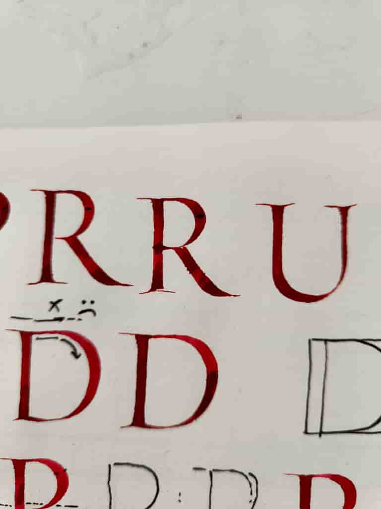 Durant mes années de pratique, ayant patiemment appris l’une après l’autre toutes les écritures latines, la dernière qu’il me manquait est aussi réputée la plus difficile à tracer en calligraphie: la Capitale romaine. Elmo ne se contente pas d’avoir une maîtrise parfaite. Ses lettres ont de la vie, du mouvement. Je ne pouvais pas rater l’occasion de suivre pour la seconde fois son enseignement, et découvrir le secret derrière sa précision et sa sensibilité. Après avoir participé au stage de minuscule romaine, c’était donc au tour de la redoutable Capitale. Je rejoignais pour cela une douzaine d’autres élèves confirmés et avisés, pour ne pas rater cette masterclass.
