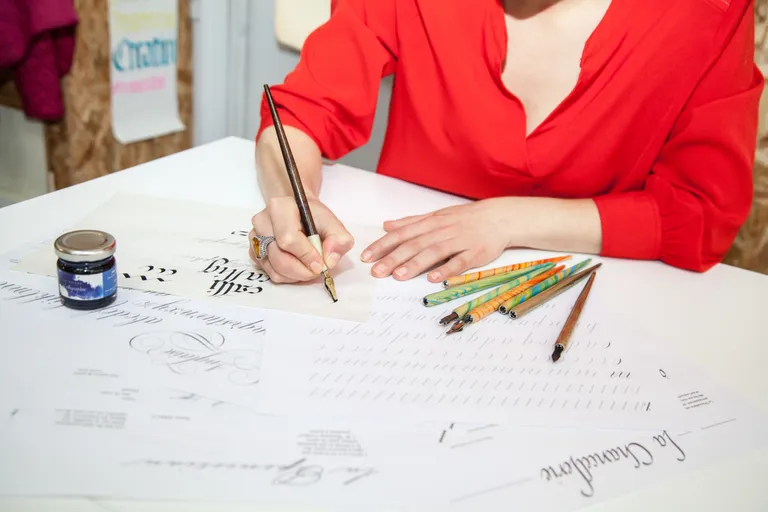 La calligraphie est une activité nécessitant une forte concentration, presque méditative. Céline aménage votre espace pour y installer le matériel nécessaire au bon déroulement de la formation (plumes, encre et papier). Un seul atelier suffit pour constater des progrès.